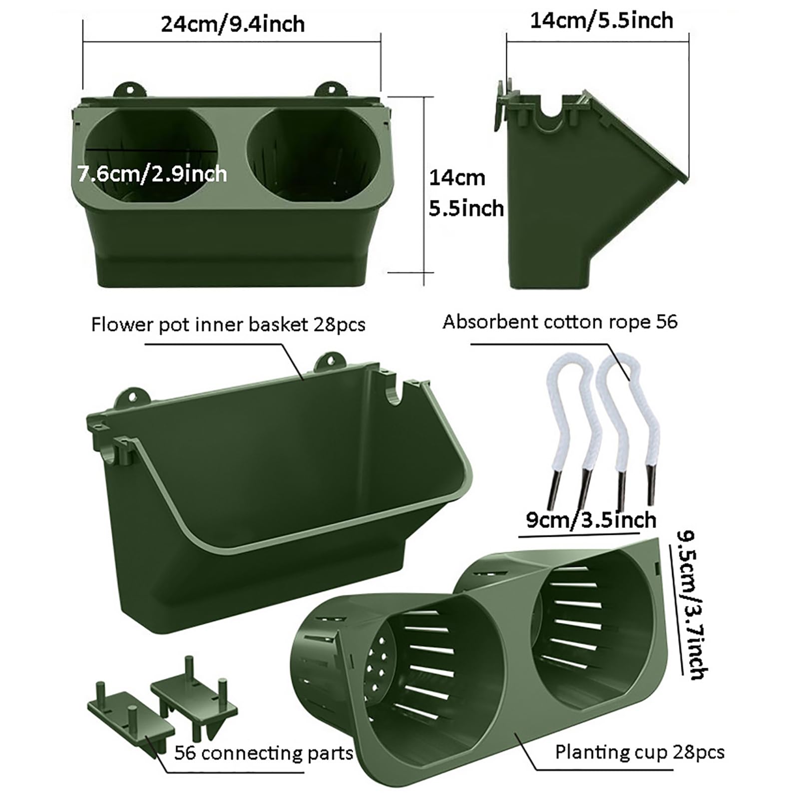 Einzelheiten: Verwandeln Sie Ihr vertikales Gartenerlebnis mit unserem innovativen Wand-Pflanzgefäß-Set, das entwickelt wurde, um Ihren Wohnraum zu maximieren und gleichzeitig Ihrer Umgebung einen Hauch von Grün zu verleihen. Hergestellt aus umweltfreundlichem PP-Material, ist dieser vertikale Übertopf robust und nachhaltig, was ihn zu einer hervorragenden Wahl für den Innen- und Außenbereich macht. Mit Optionen für 28 oder 56 Pflanzlöcher ermöglicht dieser vielseitige Pflanztopf die Kultivierung einer Vielzahl von Pflanzen, von lebendigen Blumen bis hin zu frischen Kräutern und Gemüse. Mit den Maßen 24 x 14 x 14 cm pro Einheit passt es nahtlos in enge Räume und ist somit ideal für Balkone, Terrassen oder sogar kleine Innenbereiche. Unser Wand-Pflanzgefäß verfügt über eine Wasserspeicherkapazität von ca. 250 ml, um sicherzustellen, dass Ihre Pflanzen ohne ständige Wartung die benötigte Feuchtigkeit erhalten. Das gesättigte Gewicht pro Quadratmeter von ca. 31 kg ermöglicht eine robuste Einrichtung, die Ihre Gartenarbeit unterstützen und gleichzeitig ein gepflegtes Erscheinungsbild beibehält. Das Paket enthält ein komplettes Set für die Gartenarbeit mit erhöhten Wänden, das Ihnen alles bietet, was Sie brauchen, um Ihre vertikale Gartenreise zu beginnen. Egal, ob Sie ein erfahrener Gärtner sind oder gerade erst anfangen, dieses Wand-Pflanzgefäß-Set bietet eine hervorragende Gelegenheit, Ihren Wohnraum mit üppigem Grün zu verschönern. Entdecken Sie die Schönheit der Natur und optimieren Sie Ihr Gartenpotenzial mit unserem Wand-Pflanzgefäß-Set, perfekt für atemberaubende vertikale Gärten, die in jeder Umgebung gedeihen.